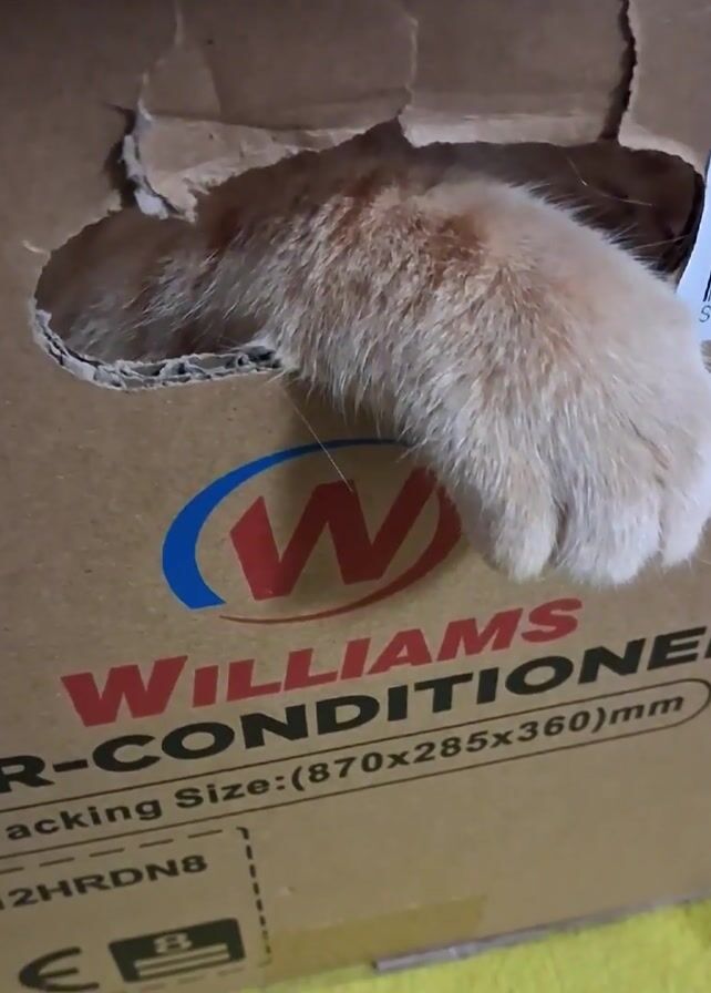 A short video depicts a cat inside a brown cardboard box that formerly contained a "Williams AIR-CONDITIONER". The box has a hole cut into it through which the cat's paw initially emerges. The cat then moves, withdrawing its paw and revealing its face peering out of the hole.