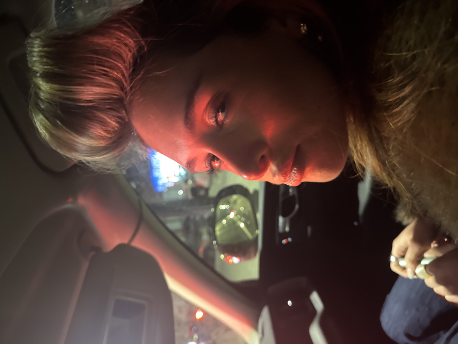 A woman's face is illuminated with a reddish glow in what appears to be a car interior at night