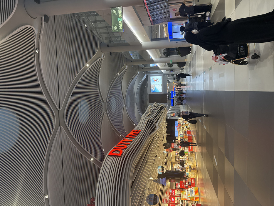 The interior of a modern airport terminal features a uniquely designed ceiling with interconnected, arched panels and linear textures. A "DUTY FREE" shop is visible. Passengers are walking through the terminal, with flight information boards displayed in the background. Some are near the "NAPZONE" sign. The flooring is a mix of gray and brown tiles. The scene is well-lit, emphasizing the architecture and commercial spaces.