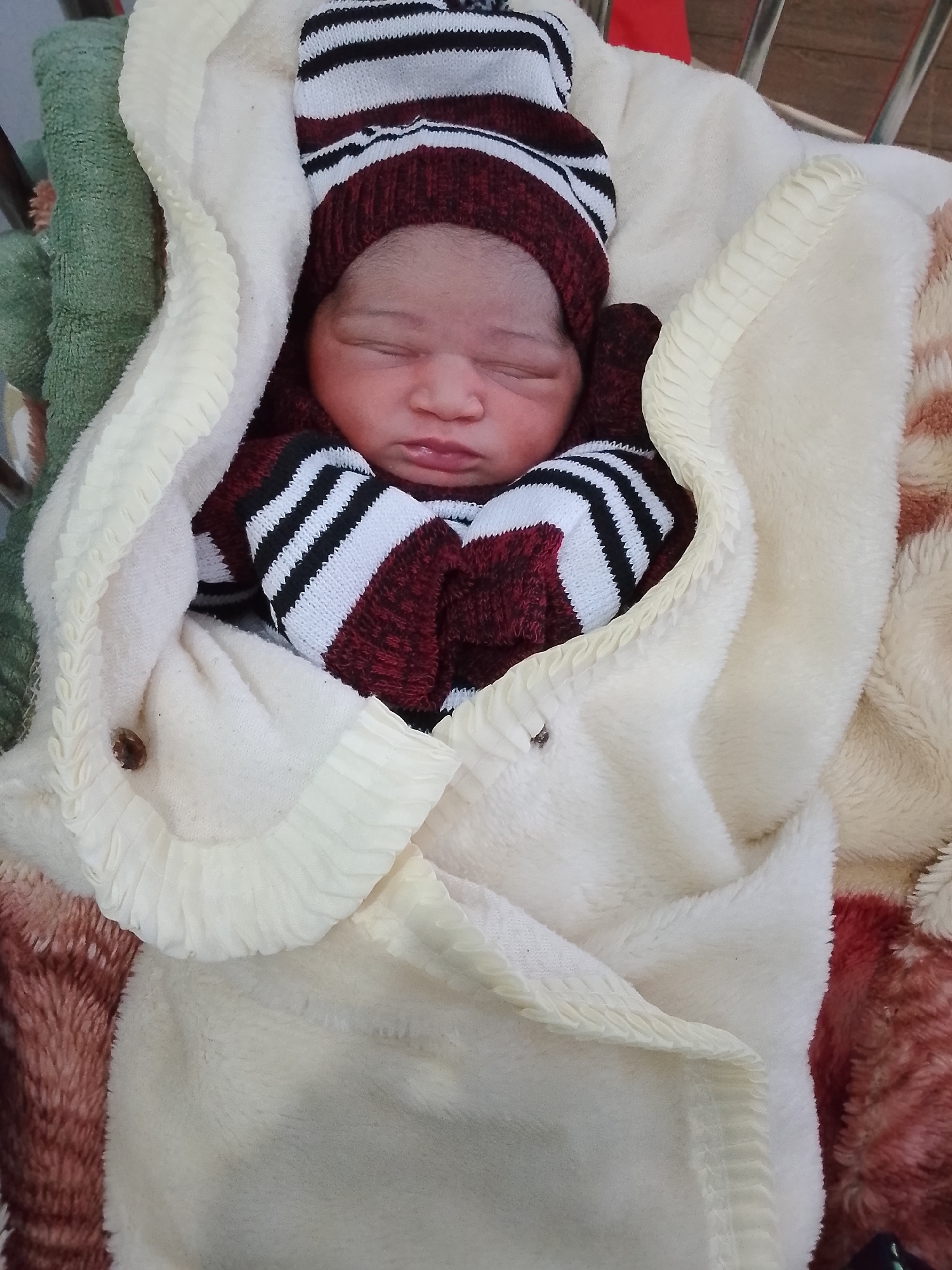 A newborn infant is depicted sleeping, with eyes closed, positioned centrally in a top-down view. The infant wears a maroon and white striped knitted hat and a matching long-sleeved outfit. The baby is swaddled in a cream-colored, soft blanket with a ruffled or braided edge. Portions of a brown and cream patterned blanket are visible beneath and to the right of the infant, while a green textured fabric is partially visible on the left. Metallic bars, consistent with a crib or bed frame, are present in the upper background. The scene is located in Sabon Tasha, Nigeria.