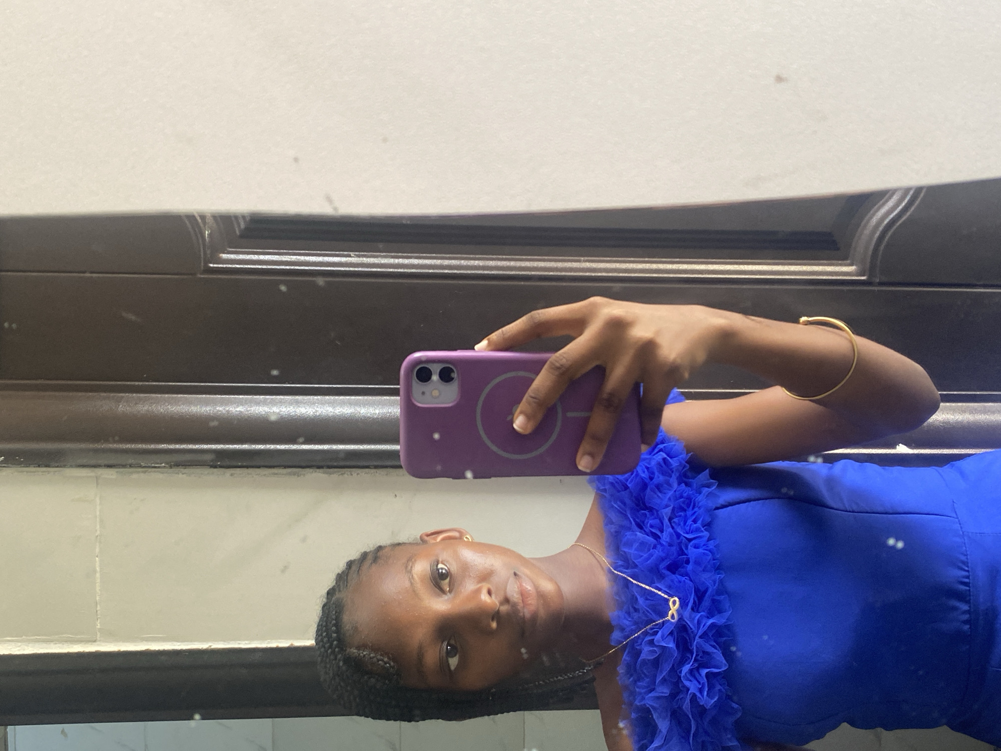 A young, dark-skinned woman with braided hair is taking a selfie in a mirror. She is wearing a royal blue dress with a ruffled collar and a gold chain necklace with an infinity pendant. She is holding a purple iPhone in her right hand. The mirror is framed by dark brown trim, and the background is a beige-colored wall or surface. The location is unknown, but specified as Ado, Nigeria.