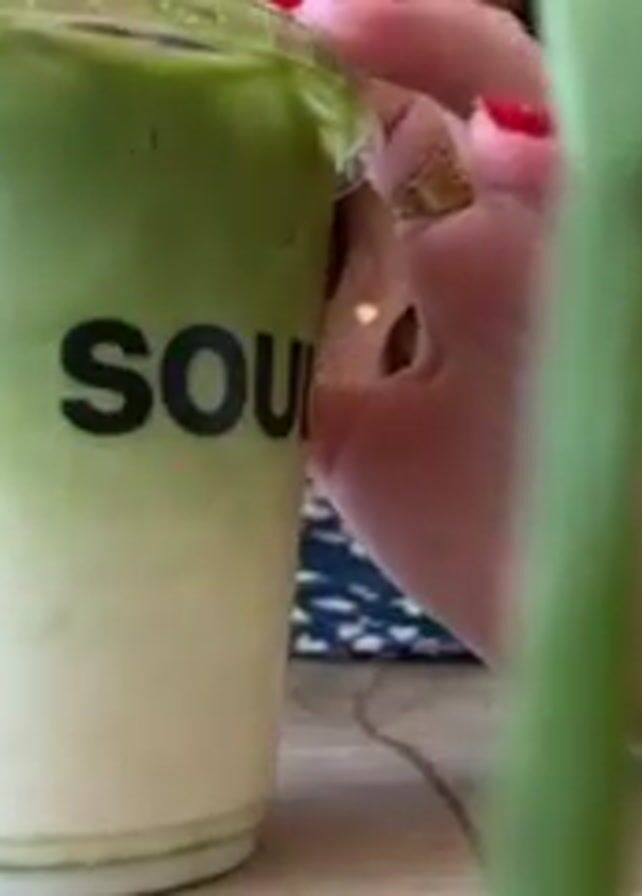 A woman with red nail polish is shown at a table, stirring a matcha latte in a clear plastic cup with a straw. The cup has the word "SOUR" printed on it. The cup is full, with a layer of green matcha on top of a white layer of liquid. The woman is wearing a gold bracelet and a patterned top. A blurry green plant is partially obscuring the view in the foreground.