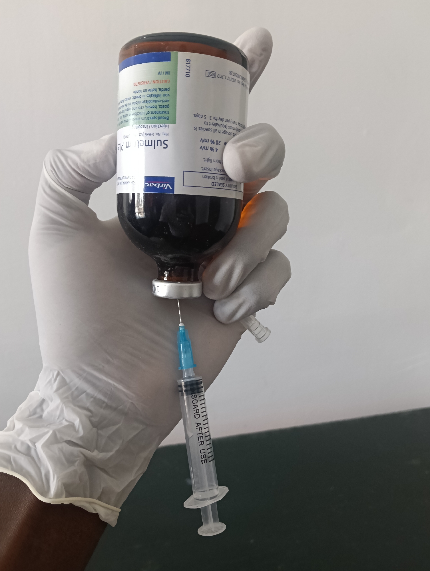 A gloved hand holds a bottle labeled "Sulmetrom Plus" while a syringe draws liquid from it