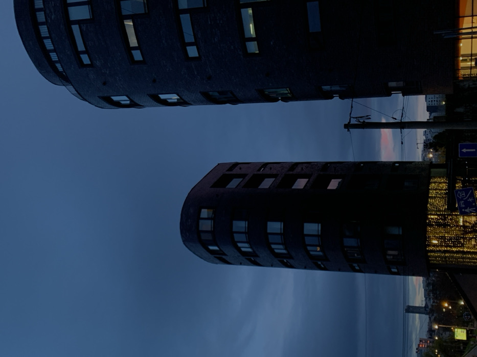 Two rounded dark buildings rise toward a blue-grey sky. Windows are visible on both structures. Between them, a street scene is vertically oriented. This includes street lights and other signage. The overall scene has a nighttime or early dusk feel.