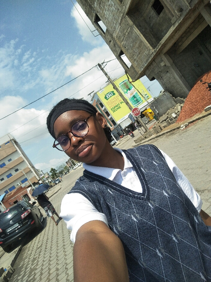 A selfie captures a dark-skinned individual in Cotonou, Benin, on a bright, partly cloudy day