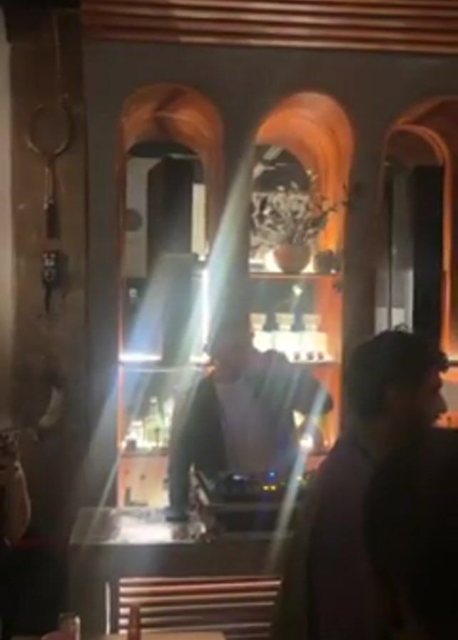 crowded bar or club, with a DJ performing behind a counter. The DJ is wearing a white shirt and a dark jacket. The bar is decorated with three arched shelves, filled with bottles and decorative items. There are people standing near the bar, and a few red plastic cups and a beer bottle on the counter. One person is taking a video with their phone. The room has a modern, dimly lit interior.