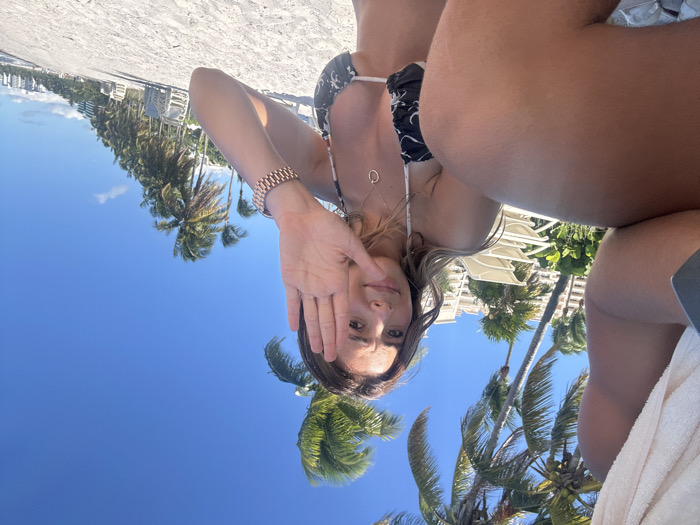 The image captures a sunlit beach scene in Key Biscayne, Florida, United States, specifically on the beachfront facing a resort structure consistent with The Ritz-Carlton Key Biscayne. In the immediate left foreground, a tanned limb and a white towel belonging to a partially visible person are present. Centrally to the right, a young adult female with light brown hair is visible, wearing a black and white patterned bikini top, a gold chain necklace with a circular pendant, and a gold-toned wristwatch on her left wrist. She looks towards the camera with a slight smile, her right hand raised, palm facing the lens. The background features a wide, white sandy beach extending to the right, lined with numerous tall palm trees and several rows of white lounge chairs. Beyond the vegetation, multi-story white resort buildings are visible beneath a clear, bright blue sky.