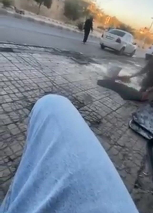 first-person view of someone sitting outside, wearing blue jeans. In the background, two people are working near a street, possibly washing or cleaning car mats on a wet, patterned surface. A woman in a black dress walks across the street. Two cars are parked on the side of the road. The environment looks like a sunny day in a residential or urban area.