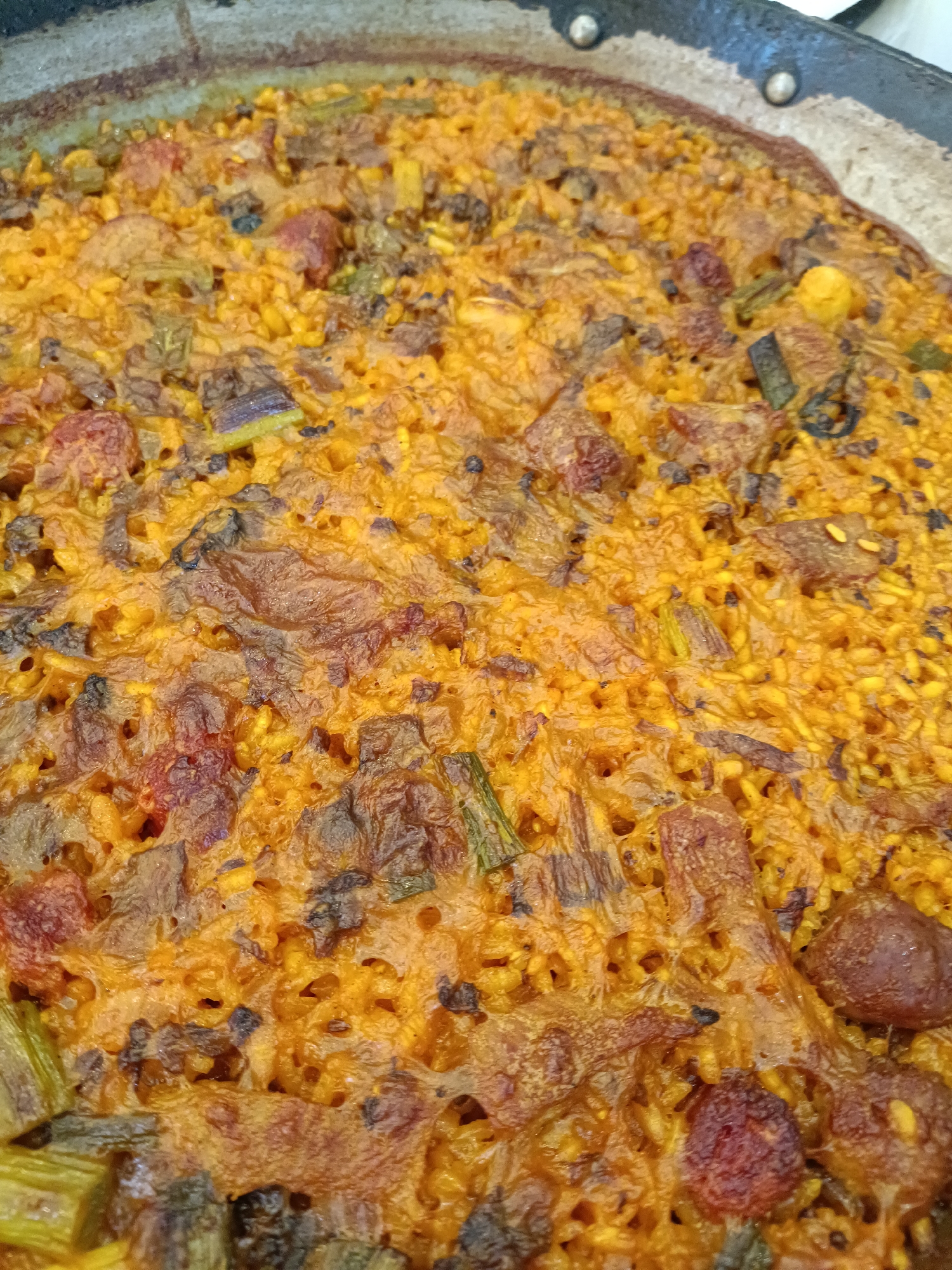 - "A close-up, top-down view shows a large, circular metal paella pan (paellera) filled with a freshly prepared, vibrant yellow-orange rice dish, identified as a form of paella" by FM-BdCXB3, licensed under CC BY 4.0