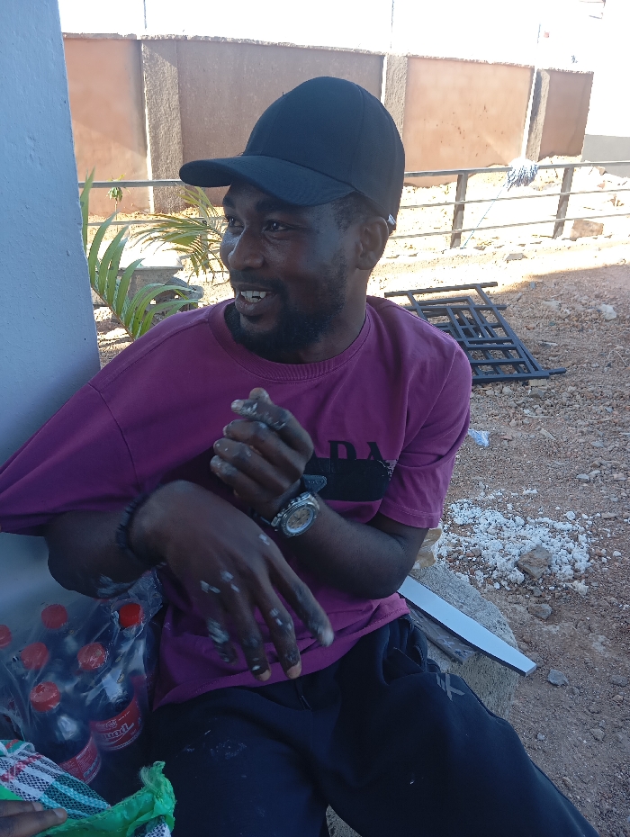 An adult male is observed seated outdoors in Reifild-Ist, Nigeria, leaning against a light-colored pillar. He wears a black baseball cap, a maroon short-sleeved shirt with a partial "PRADA" logo, and dark sweatpants. His left wrist displays a silver-toned wristwatch and a dark beaded bracelet. His hands are raised and have multiple white specks, consistent with paint or plaster. The male is smiling or laughing, looking towards the viewer's left. Adjacent to him on the ground is a clear plastic bag containing multiple small bottles with red caps and dark liquid. A green and white striped material is partially visible in the bottom left. The unpaved ground consists of reddish-brown dirt, gravel, and white debris. In the background, unfinished light-brown wall sections or blocks are present, with a metal railing and a blue and white mop head visible behind them. Sparse green vegetation is also in the background. A black metal grate lies on the ground to the right of the male, and a light-colored rectangular object rests on stones near his feet. The scene is under bright daylight.