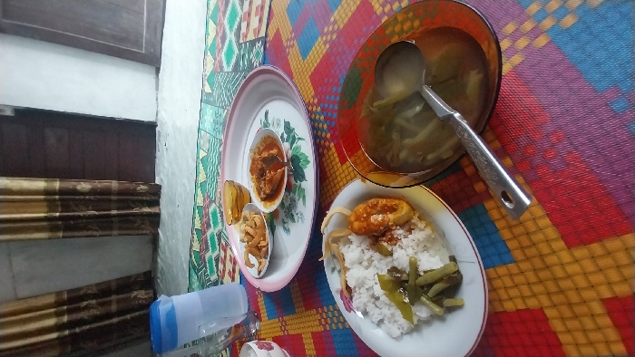 A table setting showcases a colorful woven mat upon which rests a tray holding a bowl of curry, a dish of what appear to be fried noodles, and a plate of rice topped with fried tofu and green beans. A bowl of soup with a ladle sits nearby. To the side, a partially visible water bottle and a cup add to the domestic scene.