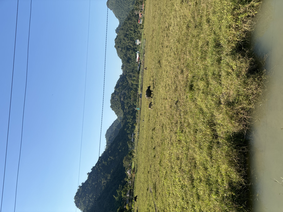 A landscape features rolling green hills under a clear blue sky. Several electric power lines cut across the sky. A field with tall grass occupies the foreground, with two animals, appearing to be cattle, grazing. In the distance are green, forested hills. A narrow canal borders the right side of the field, with vegetation growing along its bank.