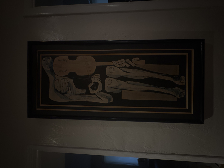 An interior photograph depicts a vertically oriented, framed piece of artwork centrally mounted on a light-colored, textured wall within a residential space in Miami Shores, United States of America. The artwork, characterized by a dark background, features a stylized, elongated, and somewhat gaunt human figure rendered in light grey and beige tones. The figure is depicted in a seated or hunched posture, with its head resting against a light brown, stringed instrument resembling a cello or violin. One hand is positioned near the neck of the instrument, while the other hand, at the bottom right, appears to be gripping the lower section of the instrument. The artwork is enclosed within a thick, dark brown or black frame with a prominent gold or brass inner trim. The scene is dimly lit by an overhead light source. To the left of the artwork, a partial view of a doorway reveals a deeper, darker room with a vertical light source visible on the far wall. To the right, another doorway shows a dark interior. No individuals are visible in the scene.