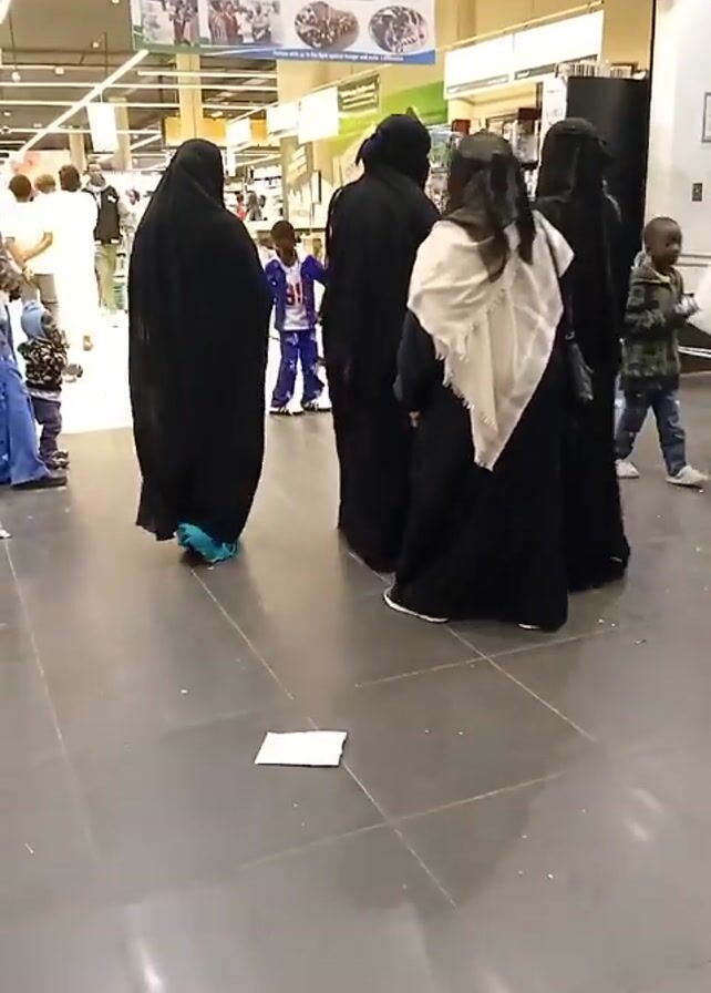 five women in dark robes and head coverings standing in a supermarket. The women are clustered together near the entrance of the store, which is marked by a "Foodplus" sign. One woman has a light-colored shawl over her head. Several children are also present in the vicinity. A small piece of white paper lies on the tiled floor. The lighting in the supermarket is bright, and there are other shoppers and displays visible in the background.