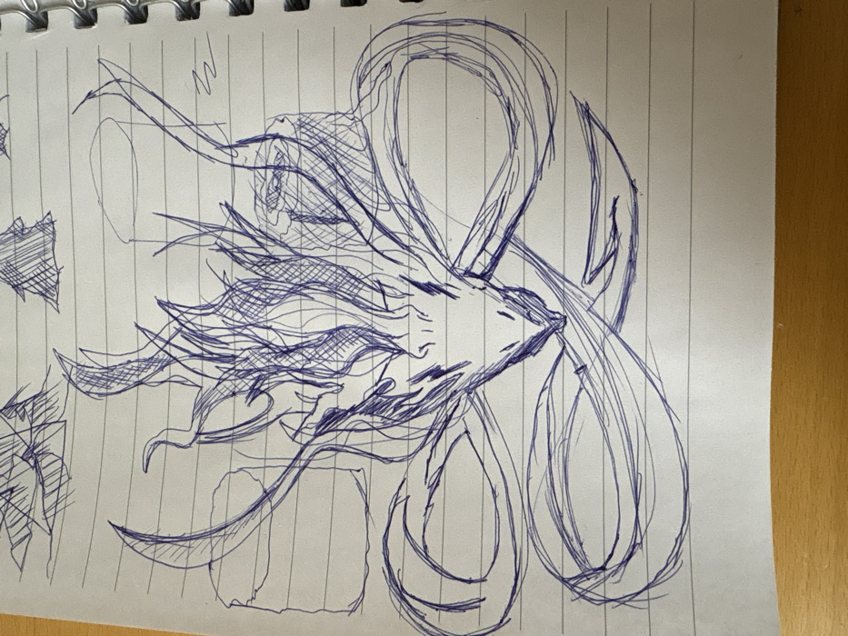 The image displays a blue ink drawing on a sheet of white, horizontally-lined notebook paper. The paper exhibits a spiral wire binding along its right edge and rests upon a light-toned wooden surface. The central subject is a stylized, mythical creature, possibly a dragon or elemental spirit. It features a pointed, angular snout with minimalist eyes and mouth. A voluminous, intricate mane composed of numerous wavy, spiky, and flame-like tendrils extends from its head, with some areas detailed by cross-hatching. Multiple long, flowing, unshaded, ribbon-like appendages emanate from the creature's body, intertwining and looping around its central form. In the upper portion of the paper, above the main subject, several abstract, cross-hatched triangular shapes are depicted, resembling mountains or stylized trees. On the mid-left, a roughly sketched rectangular block and a circular outline are visible. On the mid-right, a cylindrical shape and a partially shaded, textured cylindrical form, resembling a tree stump, are present. The image itself is a static photograph of a drawing; it does not depict a real-world scene or specific location within Vaasa, Finland.