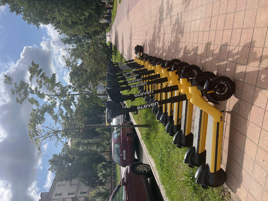 The image displays an urban street scene on a clear, partly cloudy day in Minsk, Belarus. Approximately eleven bright yellow and black "Eleven" brand electric scooters are parked in a single file on a red-tiled sidewalk in the foreground, facing away from the camera. To their left, a narrow strip of green grass separates the sidewalk from a paved road. A dark red Volkswagen Golf with Belarusian license plate "4327 MC-7" is parked on the road, alongside the grass strip. A portion of a dark red SUV is visible in the extreme left foreground. Mature deciduous trees with green foliage line the street, extending into the background. In the far distance on the right, the red-tiled sidewalk continues, and a single pedestrian is visible walking away from the camera. Multi-story residential buildings are visible in the background on the left side of the street. The sky is a mix of blue and large white cumulus clouds, and bright sunlight casts prominent shadows from the scooters and trees onto the sidewalk.