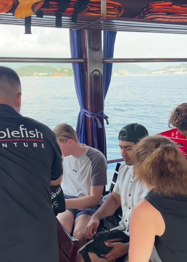 inside of a boat with several people standing and sitting. There are life jackets stored in the overhead. A man wearing a black shirt with the words "Rumblefish Adventure" is standing with his back to the camera, followed by two seated passengers. More people appear as the camera pans to the right, including two men wearing black shirts; one has a flag on his sleeve, and the other shirt says "Sailing Club Divers." A red crate sits near them. A woman with a floral dress and a man in a light grey shirt are also standing. Other men in dark shirts are visible near a map and a bag of bananas.