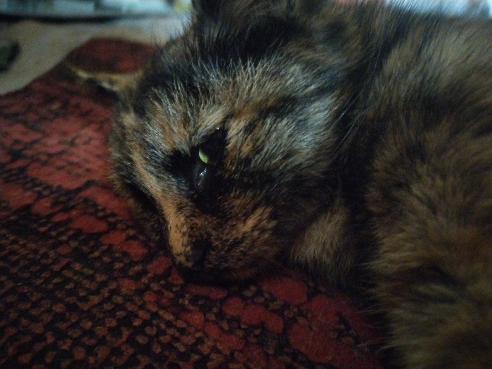 A tortoiseshell cat rests on a patterned rug. The cat's face, with its distinctive mottled coloring, is prominent. One green eye is partially visible. The fur is a mix of black, brown, and orange hues. The rug beneath has a dark red base with a complex, repeating pattern. The cat appears relaxed, possibly sleeping or resting quietly.