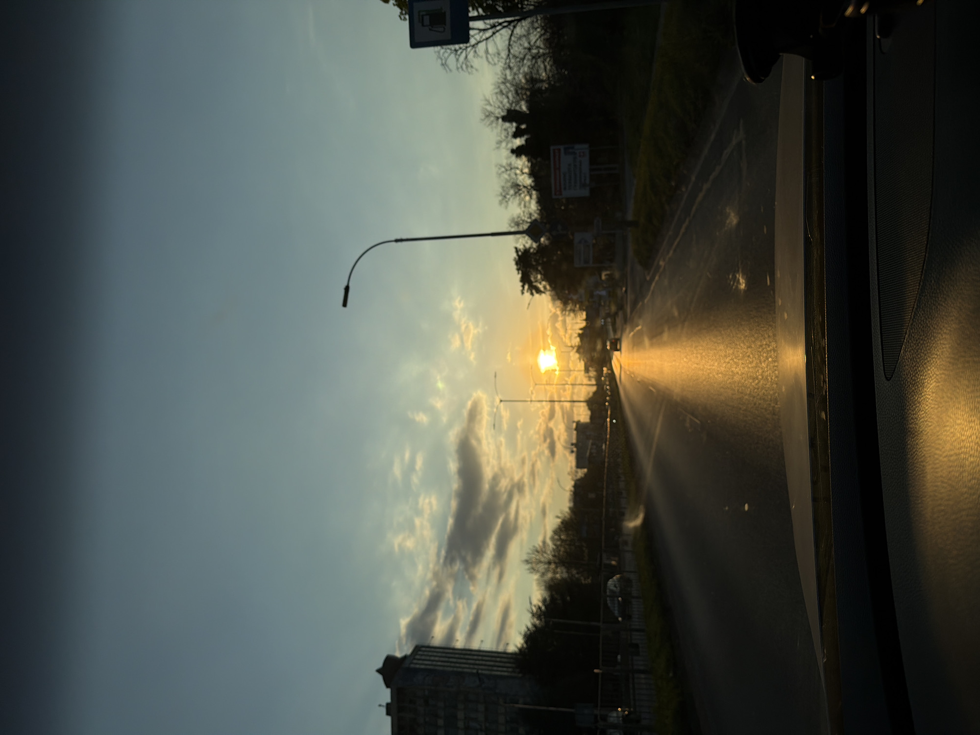 Captured from inside a car, the image faces an eastward-running, multi-lane road in Varna, Bulgaria, likely during the late afternoon or early evening. The sun is positioned low on the horizon, partly obscured by clouds, casting long rays onto the road. Along the roadside, street lamps stand tall. Additional details visible include buildings, trees, signage, and a partial view of the car's interior.