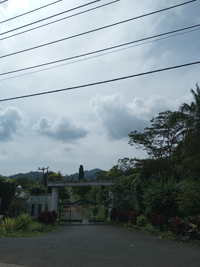 This image captures a wide view of a rural or semi-urban entrance in Kandenuwara, Sri Lanka, under an overcast sky. The upper portion of the frame is dominated by a pale grey sky with scattered white and light grey cumulus clouds, crisscrossed by five dark, parallel electrical wires. In the foreground, a dark asphalt road extends from the bottom center, leading directly towards a prominent gated entrance. The shoulders of this road are lined with dense vegetation; on the left, plants with yellowish-green sword-like leaves are visible, while on the right, dark red-leaved shrubs are prominent alongside green foliage. The midground features a light-colored, ornate entrance structure comprising two substantial pillars supporting an archway or decorative lintel. A dark metal gate, consisting of two closed panels with vertical bars and scrollwork, secures the passage. To the left of this entrance, a structure with a white dome, possibly a religious building, is partially visible amidst the trees. A utility pole with power lines is also present on the left side, behind the gate structure. Beyond the gate, an unpaved path ascends into a densely wooded area. The background consists of lush green hills covered in trees and vegetation. A single tall, slender, dark green conifer-like tree stands distinctly on a distant ridge, slightly left of the central axis. No individuals or active subjects are present within the frame.