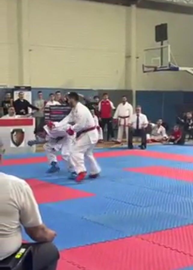 Here's a concise description of the video: The video shows a karate match in progress