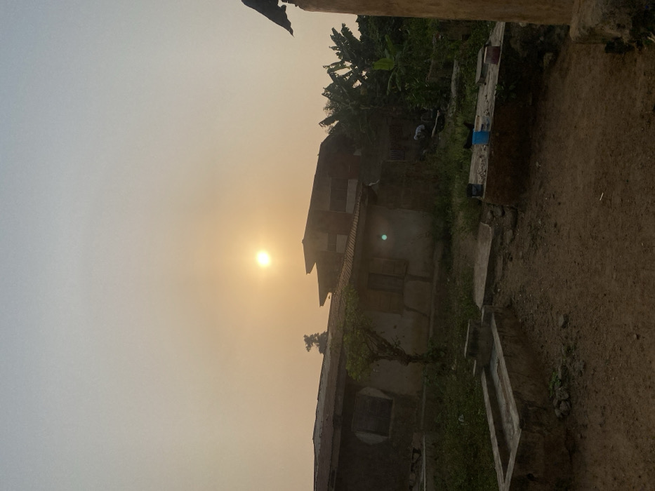 A building stands with a rusty roof against a hazy sky. The sun shines brightly, partially obscured by the haze. To the right, foliage thrives. Cement structures litter the ground, juxtaposed with natural elements. The perspective is framed by a part of a building or structure in the foreground, hinting at a vantage point from within a building. The scene exudes a sense of rural simplicity.