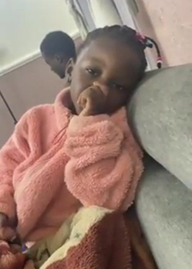 A young Black child wearing a pink fuzzy jacket is sitting on a gray surface with a brown and tan patterned blanket
