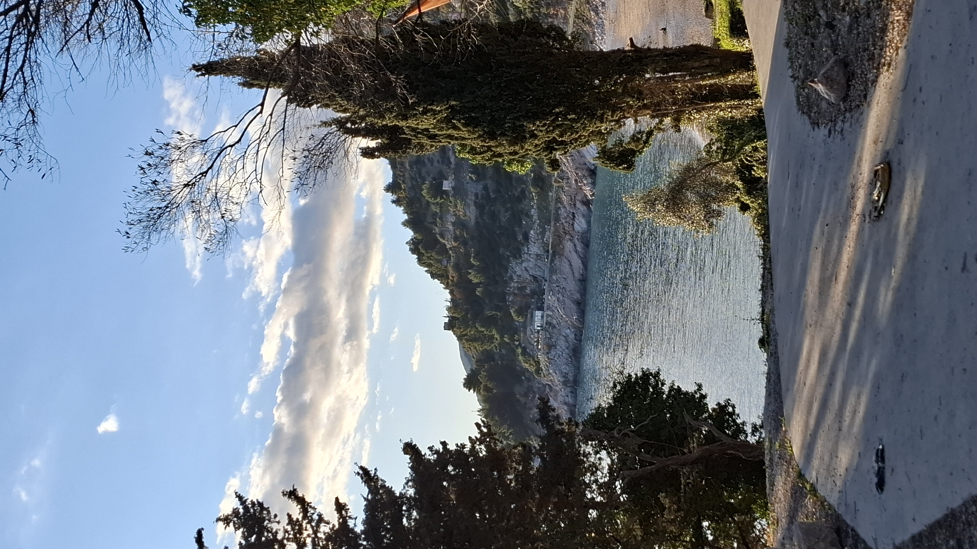 A landscape image shows an elevated view of the Adriatic coast in the vicinity of Podbadac, Montenegro. A concrete path runs along the right edge of the frame. To the left, a rocky cliff covered in vegetation descends to the coastline. The Adriatic Sea fills the center of the frame. The sky, with scattered clouds, is visible on the left, framed by trees. The image appears to have been taken at sunset, based on the direction and coloration of the sunlight and shadow. No people are visible.