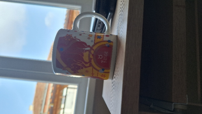 The scene depicts an interior view, likely a room within a residence, looking out a window in an unknown city. A white ceramic mug, approximately 10-12 cm in height, rests on a light brown wooden surface, which appears to be part of a table or shelf. The mug features a decorative illustration of a stylized red bull, indicative of the Taurus zodiac sign, positioned above a horizontal red band. This band contains the astrological symbol for Taurus and the Cyrillic word "Телец" (Taurus). The mug's design incorporates yellow and red accents with small scattered stars, and its handle is positioned on the right side. To the right of the mug, a dark electronic device is partially visible on the same wooden surface. Through the window, a clear blue sky with minimal cloud cover is observable, along with the reddish-brown tiled roof of an exterior building on the left side. The lower portion of the image shows a darker, recessed compartment of the wooden furniture, with a metallic component visible on the far left. No individuals are present, and no dynamic actions are depicted in the scene.