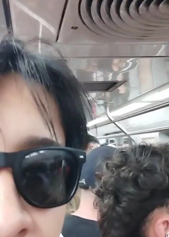 crowded subway car. The camera is held by someone wearing sunglasses, capturing a close-up view of their face and the heads and shoulders of many other passengers. The subway car's interior is mostly silver-colored, with handrails running along the top. There is a circular ventilation feature on the ceiling. The passengers are packed closely together. The camera moves slightly, shifting the focus from the sunglasses-wearer to the crowd of people. The overall impression is that of a busy commute.