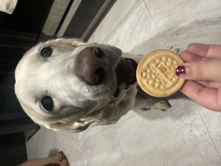 A light-colored Labrador Retriever-type dog is positioned indoors, seated on a light-colored tiled floor. The dog, exhibiting a creamy-white coat, dark eyes, and a dark wet nose, has its mouth open. A black collar is partially visible around its neck. In the foreground, a human hand, featuring dark red manicured fingernails, presents a single circular, light-brown biscuit towards the dog. The biscuit displays the embossed text "Maria Gamesa." The background consists of dark, indeterminate structures, likely kitchen cabinetry or appliances. A partial view of a human leg and foot wearing a brown sandal is visible on the floor to the left of the dog. The scene is located in a residence in Coatzacoalcos, Mexico.