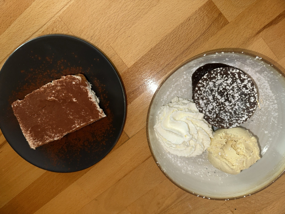 - "The image displays two distinct dessert presentations positioned on a light-brown wooden surface, suggestive of a table in an indoor setting, potentially an establishment in Suresnes, France" by FM-zGYJv1, licensed under CC BY 4.0
