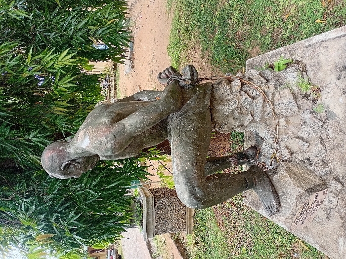 This image captures a weathered, dark-colored statue of a male figure, depicting an enslaved person, located outdoors in Lokoja, Nigeria