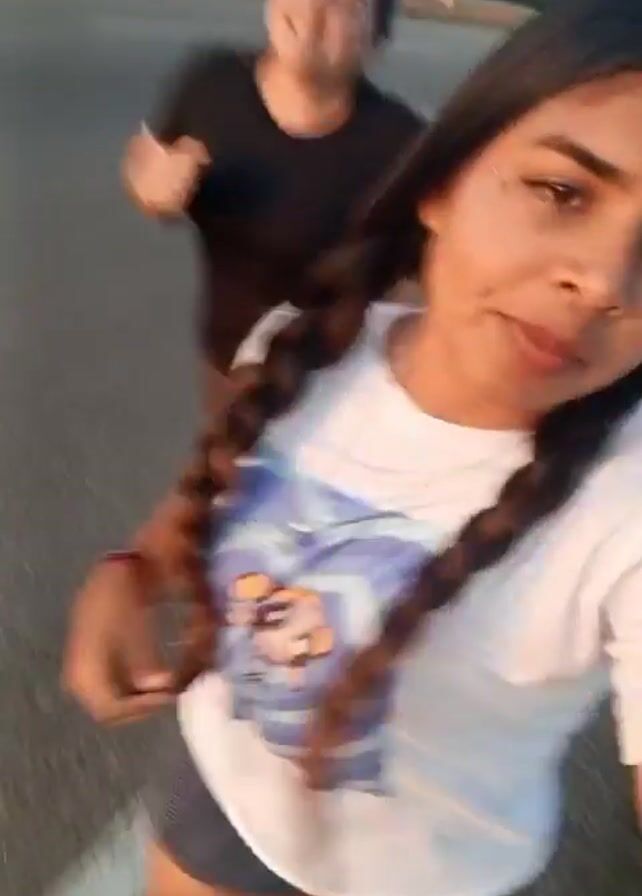 Two young women are running on the shoulder of a paved road, with mountains visible in the background. The woman in the foreground has long dark hair in two braids, and is wearing a white t-shirt with a cartoon character printed on it. She is also wearing dark shorts and a bracelet. She is holding the camera and filming herself and the other woman. The other woman is wearing a black t-shirt and dark pants, and is running slightly behind the first woman. Both women are smiling. A car passes in the background.
