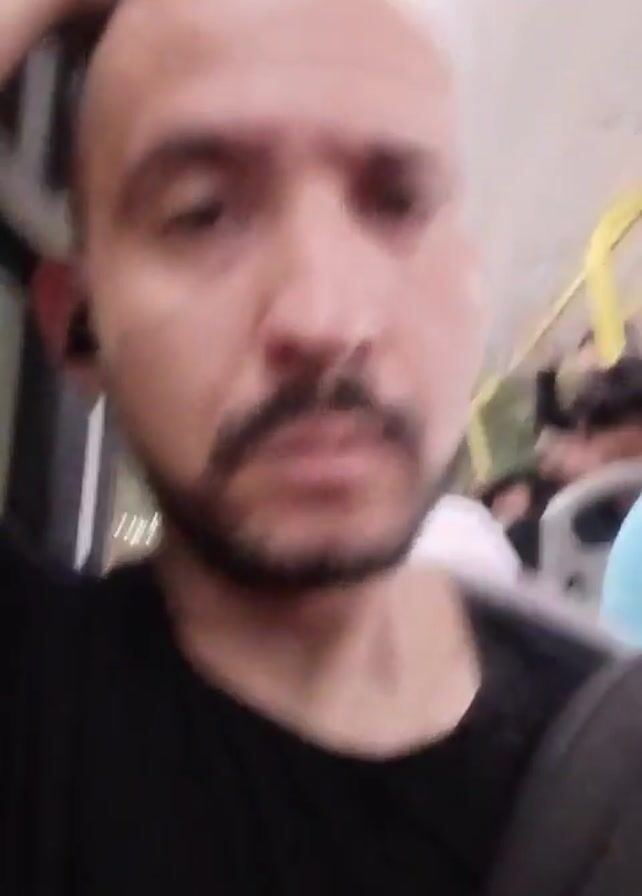 A man in a black t-shirt stands on a bus and looks at the camera. He has short, dark hair styled into a faux-hawk. He runs his hand across his hair and glances to the side. Other passengers are visible in the background. The bus has yellow handrails.