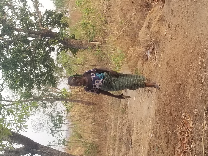 n elderly woman walking on a dirt path in a rural area of Adonkolo, Nigeria
