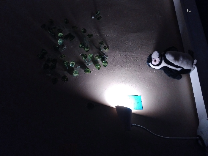 A wall is adorned with decorative vines and a stuffed animal resembling a penguin. A light source, possibly a lamp with a blue lampshade, illuminates the wall, casting shadows from the vines. The lighting emphasizes the texture of the wall and the shapes of the decorations. A power cord is visible, suggesting the lamp is plugged into an outlet near the bottom right of the frame.