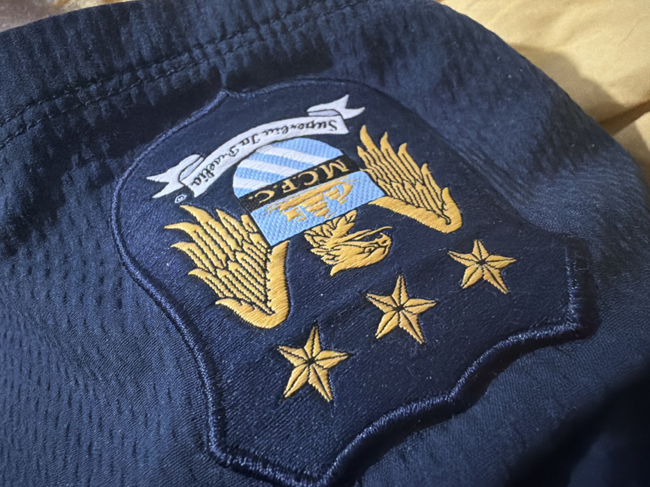 The image displays a close-up, static view of an embroidered crest patch affixed to dark blue fabric, captured in the city of Pentre, United Kingdom. The fabric, likely a textile garment, exhibits a fine, textured weave with small perforations characteristic of athletic material. The central subject is a heraldic crest, predominantly dark blue with gold, light blue, white, and black accents. The crest's design elements are as follows: - On the left side, three five-pointed gold stars are arranged vertically. - In the lower-center, a stylized gold bird or griffin with its head turned to the right is embroidered. - Extending from the center-left and center-right are prominent gold wings. - A shield-shaped emblem is positioned centrally, featuring vertical stripes of light blue and white. Overlaid vertically on this shield is the text "MCF.C." in black capital letters. - Above the central shield, a white banner-like ribbon displays the Latin phrase "Superbia In Proelia" in black script. The embroidery is precisely stitched, showing clear definition in all components. The dark blue fabric itself shows minor creasing. A blurred, yellowish-brown surface, possibly another textile or soft material, is visible in the background, underneath and to the right of the primary fabric item. No individuals, actions, or interactions are depicted within the frame.