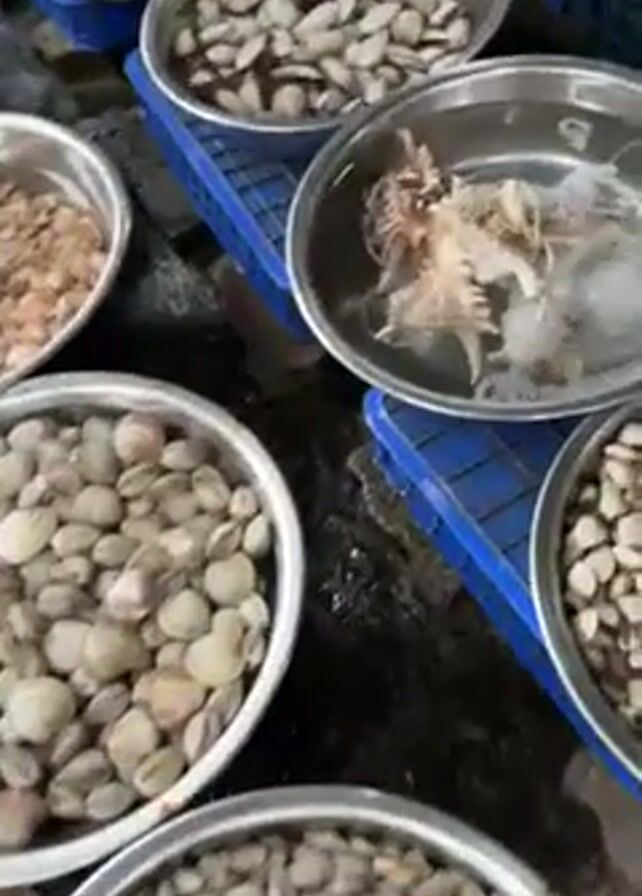 The scene shows a variety of seafood in stainless steel bowls, likely at a market or seafood stall