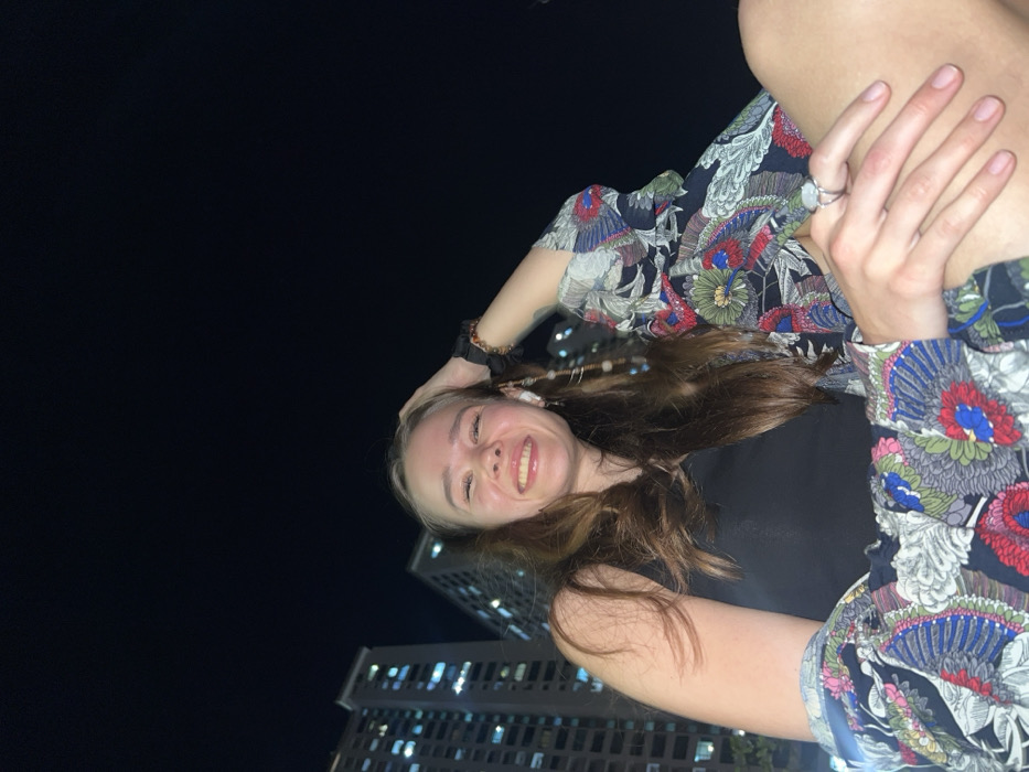 The scene depicts a young Caucasian female in an urban outdoor setting at night in Nha Trang, Vietnam. She is positioned in the lower center of the frame, smiling broadly with teeth visible, looking directly at the camera. Her long, light brown hair frames her face. She wears a black tank top and a dark-colored kimono-style jacket featuring a vibrant, multi-colored floral and foliage pattern. Her left arm is raised, with her hand resting on the back of her head. A black scrunchie and several beaded bracelets are visible on her left wrist. A white wireless earbud and a dangle earring with multiple beads are present in her left ear. Her right hand rests on her bare upper thigh, where a silver-colored ring is visible on her ring finger. In the background, two tall, modern high-rise buildings with numerous illuminated windows are discernible against a dark night sky, typical of a busy urban area within Nha Trang.
