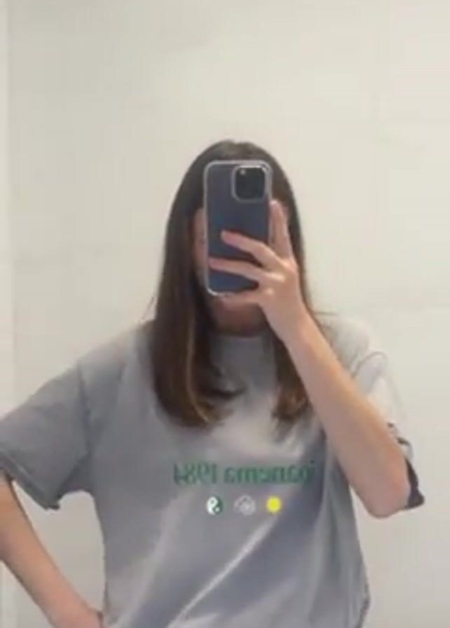 A woman with straight, shoulder-length brown hair stands in front of a bathroom mirror, taking a selfie with her smartphone. Her face is obscured by the phone. She is wearing a light gray t-shirt with a graphic design printed on the front in green, featuring text and symbols. She is also wearing dark bottoms. The bathroom has white walls and a toilet is partially visible in the lower-left corner. The lighting is bright and even.