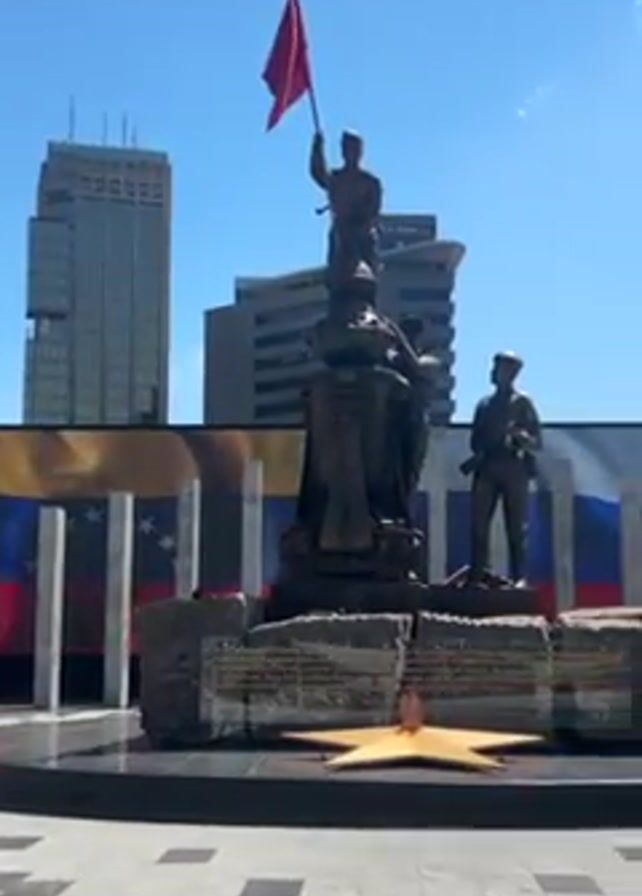 The camera pans up to reveal a bronze statue depicting soldiers, one of whom is holding a red flag. Behind the statue is a backdrop featuring the flags of Venezuela and Russia. The statue sits on a dark stone base with a bronze star emblem. The surrounding area is a tiled plaza with a tall building visible in the background. The sky is blue and clear.