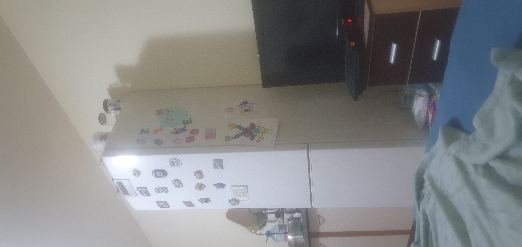 A cluttered indoor scene shows a white refrigerator covered in magnets and children's drawings. A black flat-screen television and a dark wooden dresser are positioned above and to the right of the refrigerator. Part of a blue bed with light blue bedding is visible on the right side of the image. The scene appears to be in a residential setting. The location is not discernible as Samokov, Bulgaria, as no identifying information is present.