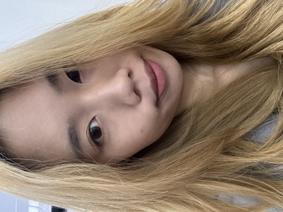 The specific location within Liangjiang, China, is not discernible from the visual information provided. The image presents a frontal portrait of an East Asian female individual positioned in an indoor setting. She has fair skin, dark brown eyes, and dark, well-defined eyebrows. Her lips are a light pink and are slightly parted. Her hair is long, wavy, and dyed a uniform light blonde color, falling over her shoulders. A grey garment is visible around her neck and shoulders. The background is a plain, light-colored wall, indicating an evenly lit indoor environment. The subject is looking directly at the camera.