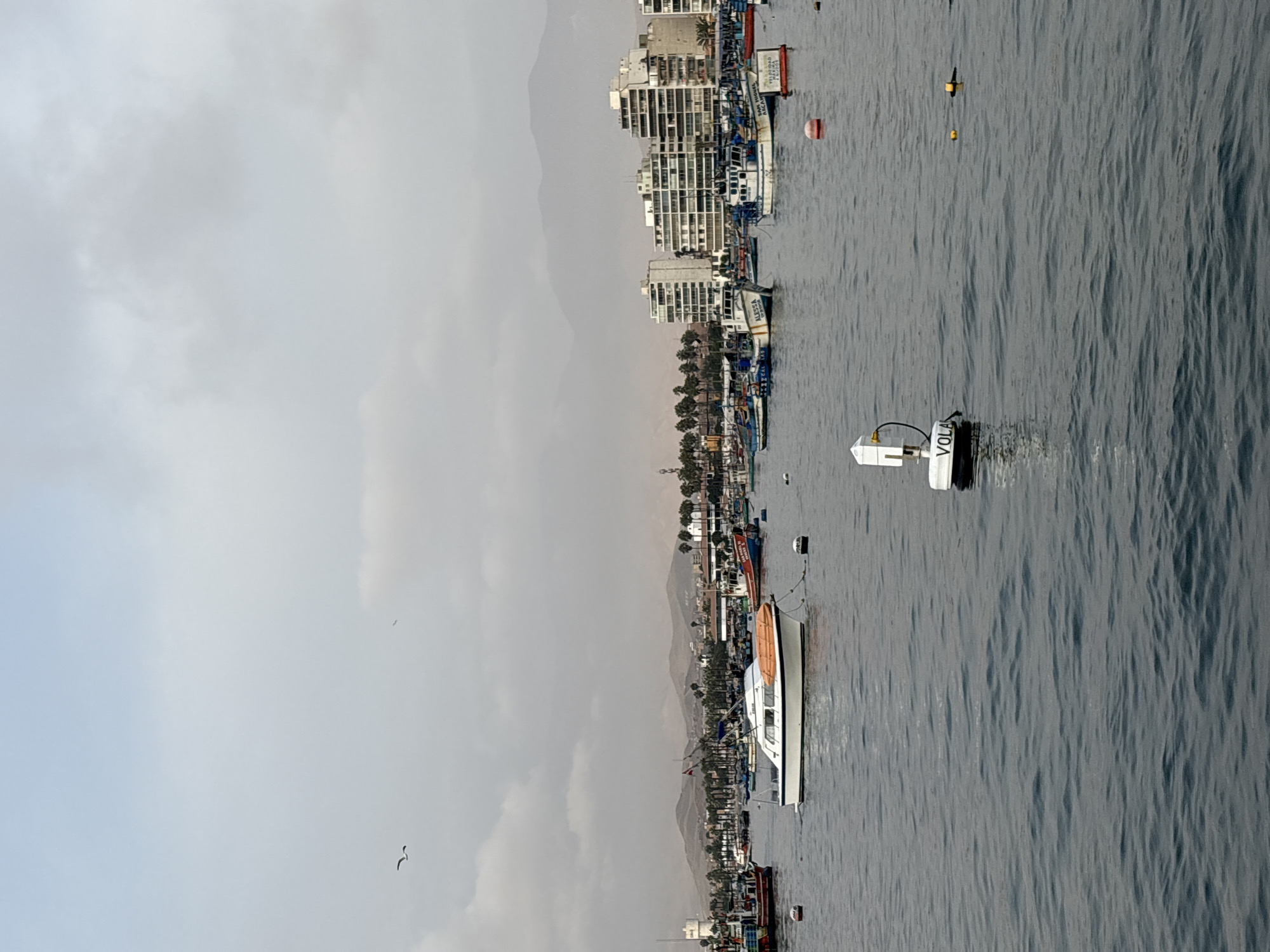 The image depicts a view of Ancón, Peru from the water. The sea is moderately choppy and several boats of varying sizes are docked or moored. A multi-story building complex sits along the coastline. The sky is overcast and grey, with mountains visible in the background, giving the scene a slightly hazy appearance. Two birds are visible in the sky.