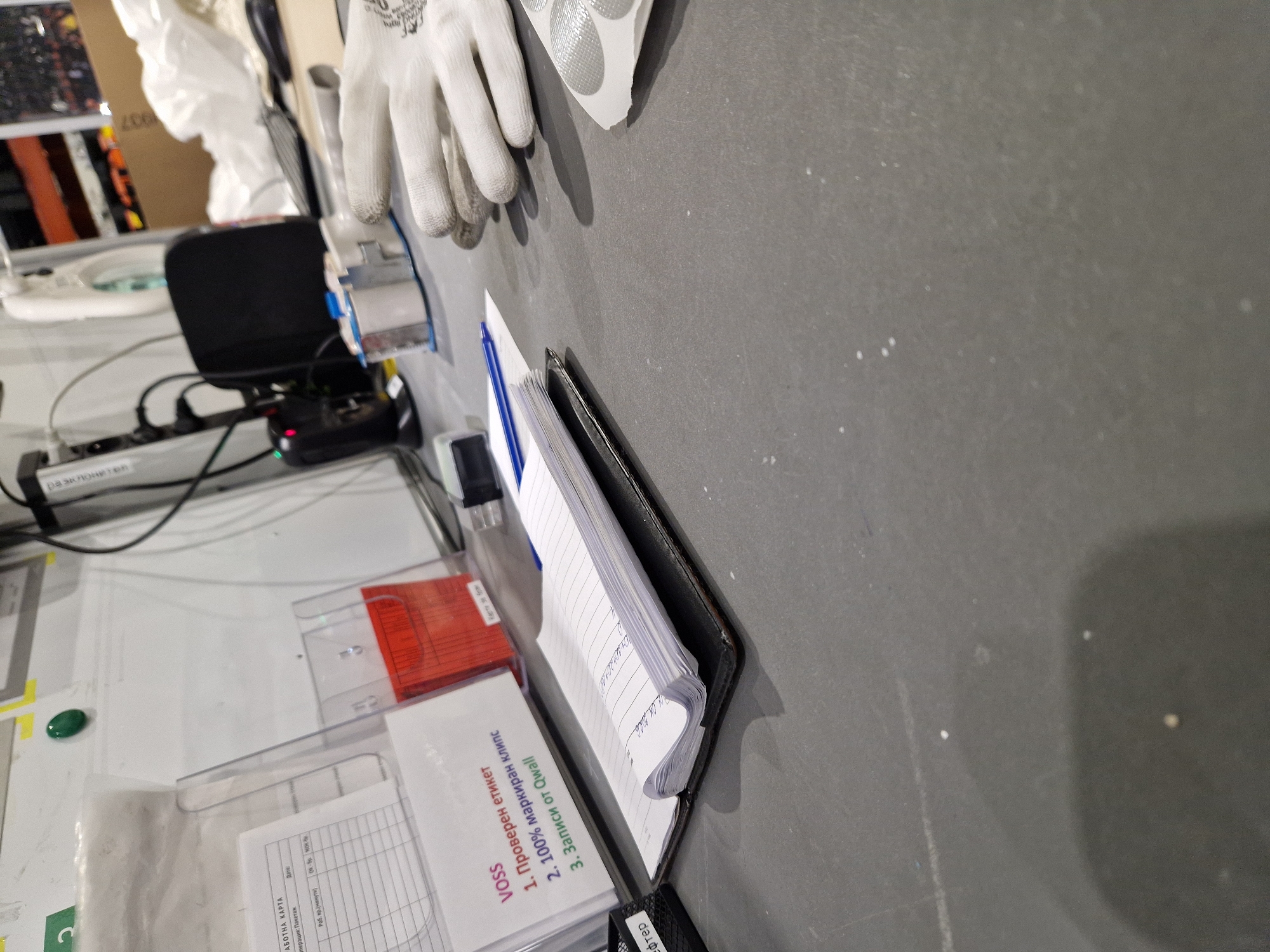 The image depicts a cluttered workspace in what appears to be an industrial or manufacturing setting, potentially within Bahovitsa, Bulgaria, based on the Cyrillic text present. Predominantly visible is a grey countertop hosting items like work gloves with reflective patches, a closed notebook with Cyrillic labels ("Проверен етикет", "маркиран клипс", "Записи от Qwall"), a blue pen, and forms in transparent plastic sleeves. The documents are labeled with "VOSS" and contain fields for date ("Дата") and operation duration ("Раб. вр. (минути)"), suggesting a process tracking or quality control system. In the background, an open shelf unit is partially visible along with a white material, likely fabric or protective gear. The presence of a power strip labeled "разклонител" suggests electronic equipment is used in this area.