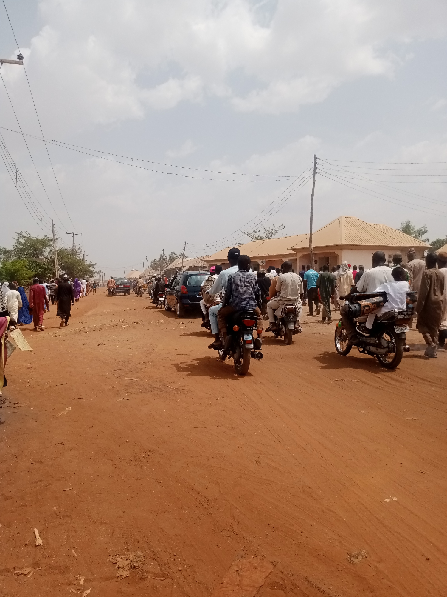 The image depicts a busy, unpaved street in Minna, Nigeria, under an overcast sky
