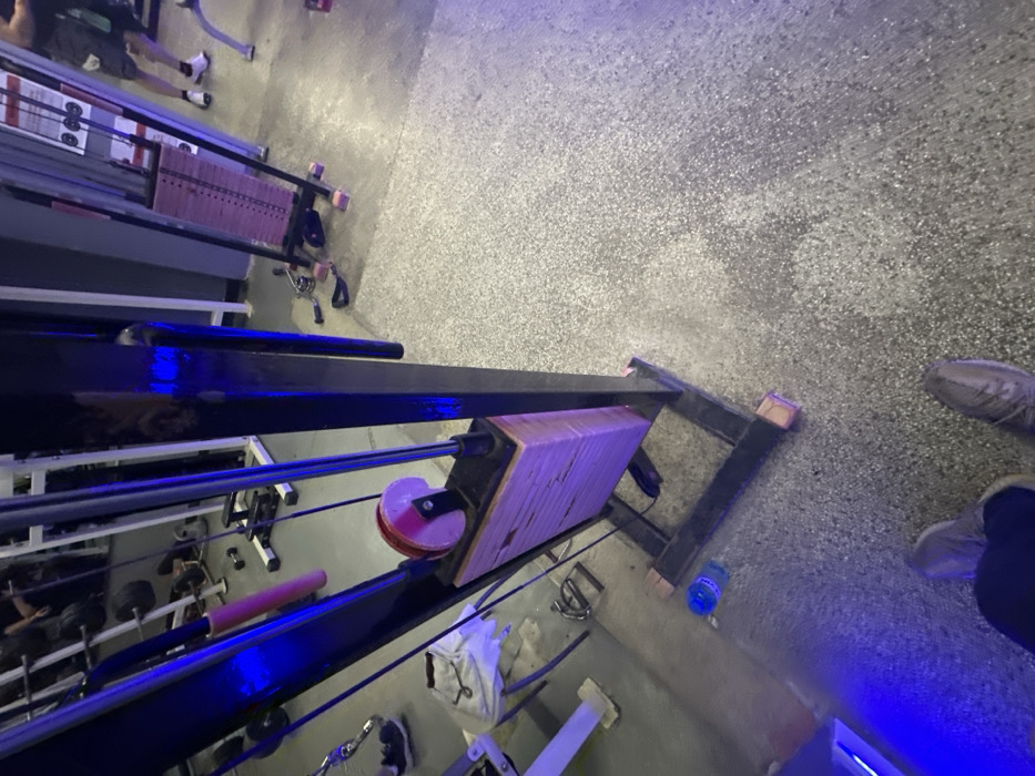 The image displays the interior of a gym in Karlovo, Bulgaria. The floor is a speckled grey. Artificial lighting is present, with a distinct blue light source originating from the lower-left, casting a blue hue and reflections on dark surfaces. In the immediate foreground, a pair of feet wearing grey athletic shoes are visible. Centrally positioned is a dark-framed cable weight machine featuring a stack of rectangular, light-colored wooden weight plates and a reddish-pink pulley mechanism near the top of the stack. A blue water bottle lies on the floor near the base of this machine. To the left of the central machine, a white fabric item, possibly a towel, is draped over a white support structure. The midground and background contain additional gym equipment. To the right of the central machine, a separate cable machine with a vertical stack of pinkish-purple weight plates is present, alongside various detached handles on the floor. Further into the background, other exercise equipment is discernible, including racked weight plates and dumbbells. The lower legs and white athletic shoes of an individual are partially visible on the right side of the frame, near the pink weight stack. Vague silhouettes of other individuals are faintly visible in the deeper background. No specific actions or interactions are clearly observable.