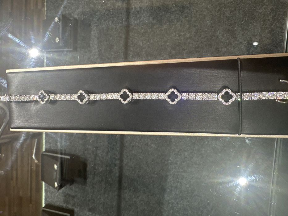 A silver-toned tennis bracelet, approximately 18-20 cm in length, is centrally displayed on an upright, rectangular black jewelry stand with a dark brown, possibly leatherette, border. The bracelet features a continuous line of uniformly sized, round, brilliant white stones. Interspersed along its length are four equally spaced, four-leaf clover-shaped motifs, each outlined with smaller white stones. A thin black elastic cord secures the bracelet to the lower portion of the display stand. The stand rests on a dark, highly reflective surface, likely the bottom of a glass display case, which shows distinct reflections of overhead lighting. In the blurred background to the left, two additional small, black jewelry stands are visible, consistent with earring displays. The scene depicts a retail jewelry display within an establishment located in Gwarinpa, Nigeria.