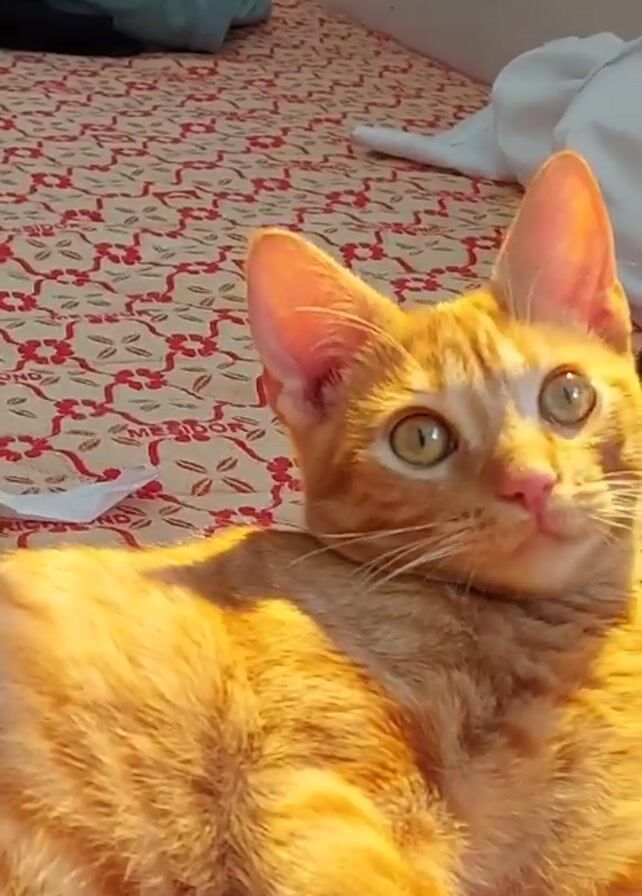 n orange cat lying on a bed. The cat is facing towards the camera and looking up and slightly to the right. The bed has a patterned red and white sheet. There is a white object and a light blue object on the bed behind the cat. A black object with white writing on it moves into frame towards the right side of the screen.